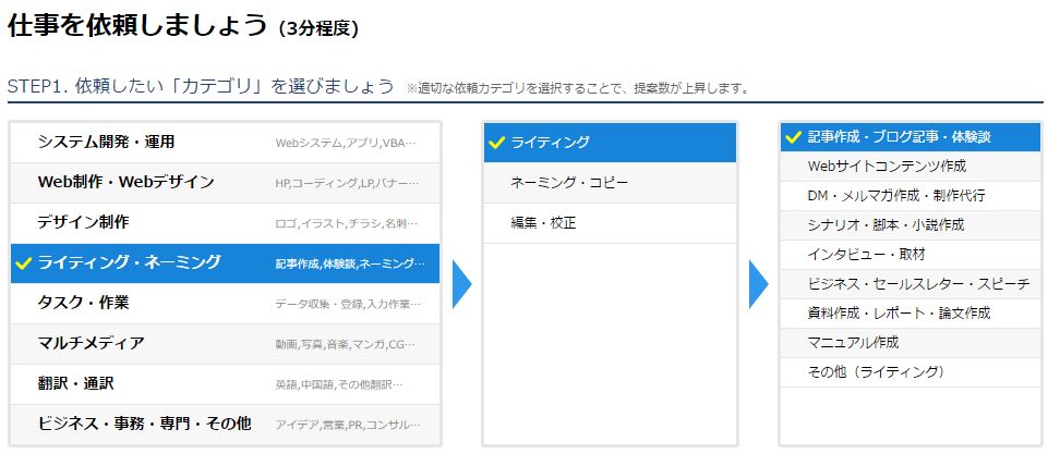 真ん中位にある「ライティング、ネーミング」⇒「ライティング」⇒「記事作成・ブログ記事・体験談」を選択してください。