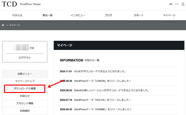 WordPressテーマ「GLUE(グルー)」はTCDの会員サイトにログインすれば、無料でダウンロードすることができます。